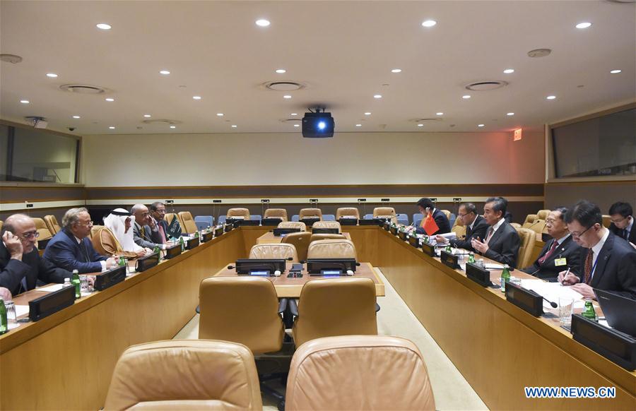 Chinese State Councilor and Foreign Minister Wang Yi (3rd R) meets with Saudi Foreign Minister Ibrahim Al-Assaf (3rd L) on the sidelines of the 74th session of the United Nations (UN) General Assembly at the UN headquarters in New York, Sept. 25, 2019. (Xinhua/Han Fang)