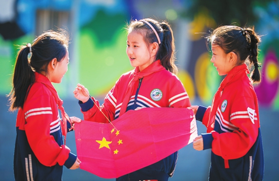 Students sew a Chinese national flag in a primary school in Hohhot, Inner Mongolia. (Photo via Xinhua)