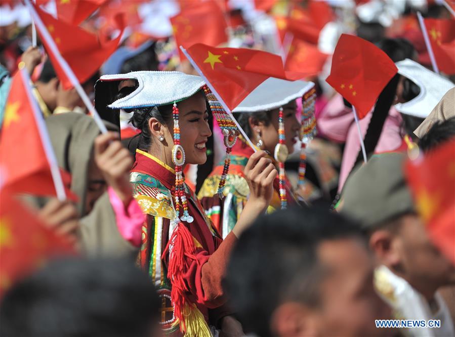 People wearing traditional clothes participate in a celebration gala at Potala Palace square in Lhasa, southwest China's Tibet Autonomous Region, Sept. 29, 2019. More than 1,000 people performed Guozhuang dance here on Sunday to celebrate the 70th anniversary of the founding of the People's Republic of China. (Xinhua/Jigme Dorje)