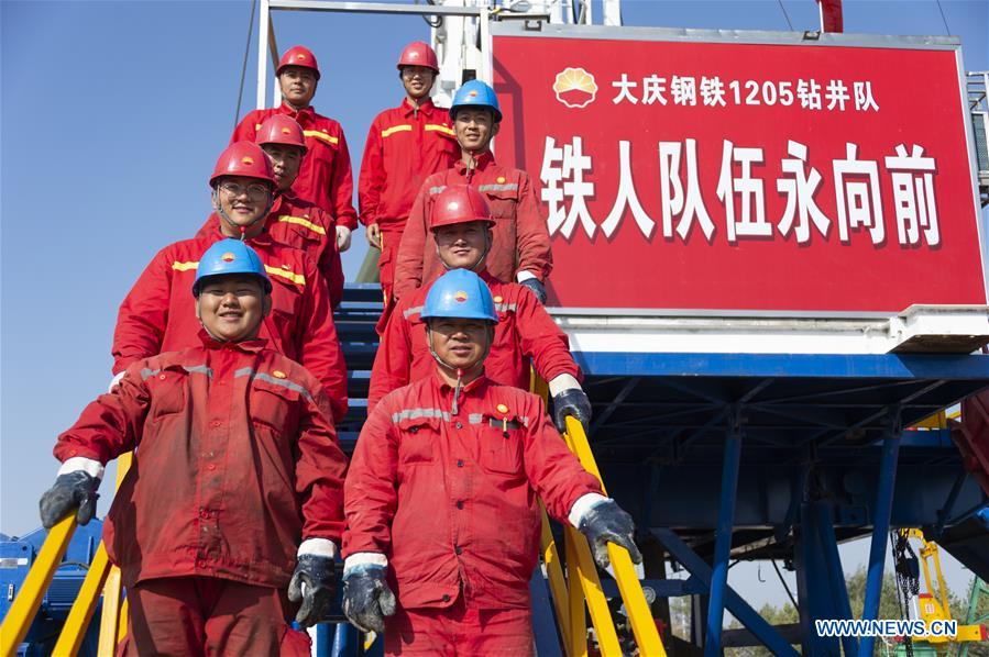 Staff members of No. 1205 drilling team pose for a group photo at a drilling rig in Daqing Oilfield in Daqing, northeast China's Heilongjiang Province, Sept. 28, 2019. Daqing Oilfield, discovered on Sept. 26, 1959, is the largest oilfield run by PetroChina and also the country's largest oil production base. The oilfield, once accounting for over half of China's total crude output, had an annual crude production of over 50 million tonnes for 27 consecutive years and over 40 million tonnes for 12 straight years. Its annual crude oil and gas output still remains over 40 million tonnes of oil equivalent, with proven oil reserves at 6.48 billion tonnes. Its annual natural gas output has exceeded 4 billion cubic meters. (Xinhua/Xie Jianfei)