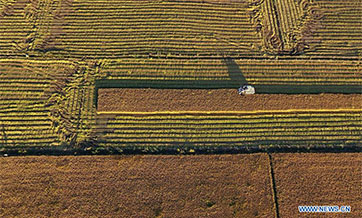 Aerial photo taken on Oct. 8, 2019 shows farmers harvesting rice with reapers in Wangtan Township of Tangshan, north China's Hebei Province. (Xinhua/Yang Shiyao)