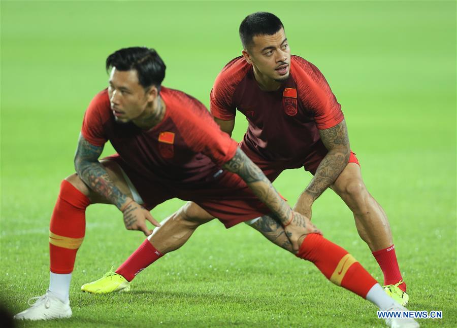 China's players attend the training session one day ahead of the group A second round match between China and Guam at the FIFA World Cup Qatar 2022 and AFC Asian Cup China 2023 Preliminary Joint Qualification in Guangzhou, capital of south China's Guangdong Province, Oct. 9, 2019. (Xinhua/Jia Haocheng)