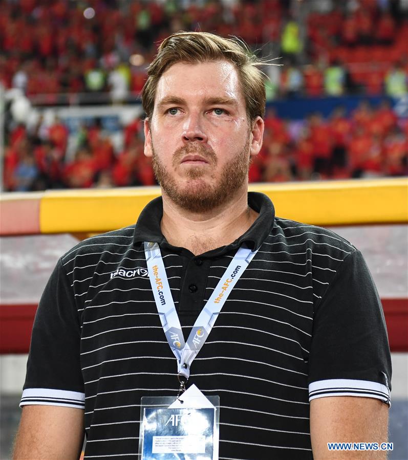 Karl Dodd, head coach of Guam reacts before the group A match between China and Guam at the FIFA World Cup Qatar 2022 and AFC Asian Cup China 2023 Preliminary Joint Qualification Round 2 in Guangzhou, capital of south China's Guangdong Province, Oct. 10, 2019. (Xinhua/Deng Hua)