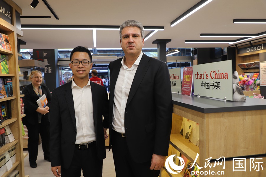 The president of Red Cat Publishing House and Press officer of the Chinese Embassy in Turkey take a photo in front of a “That’s China” bookshelf. (People’s Daily Online/Wang Chuanbao)