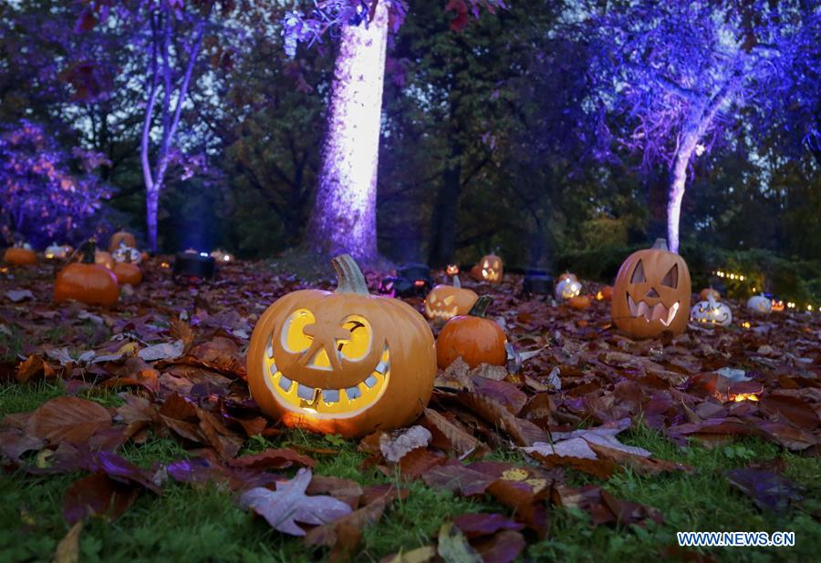 Carved pumpkins are seen at the Halloween themed "Glow in the Garden" event at VanDusen Garden in Vancouver, Canada, Oct. 16, 2019. (Photo by Liang Sen/Xinhua)