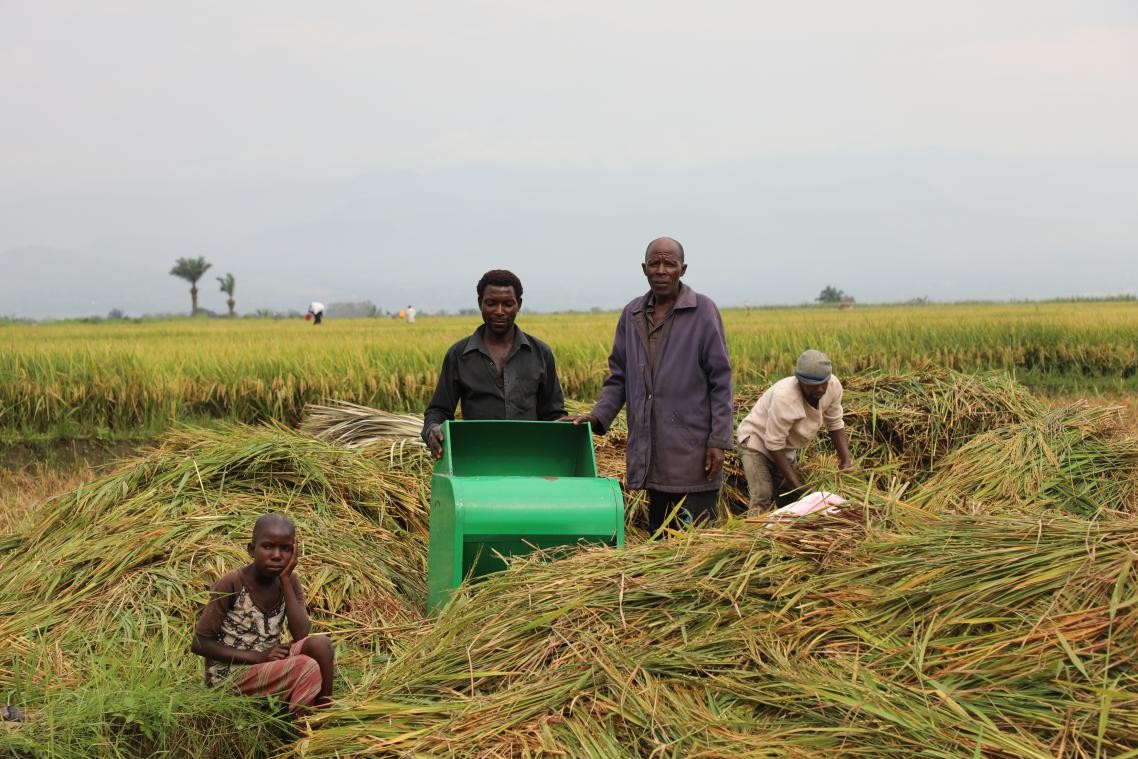 Local farmers thresh rice with a grain thresher developed by Chinese experts in a demonstration field under a China-assisted hybrid rice project in Burundi. (Photo by Lv Qiang/People's Daily)