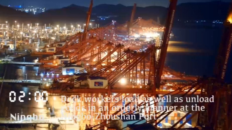 Dock workers load as well as unload goods in an orderly manner at the Ningbo-Zhoushan Port.