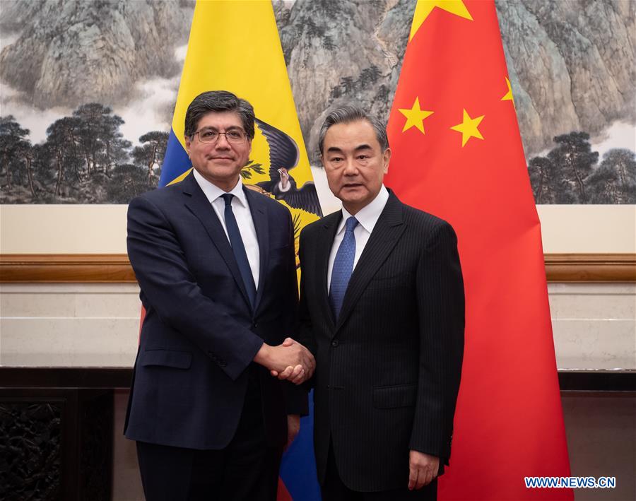 Chinese State Councilor and Foreign Minister Wang Yi and visiting Ecuadorian Foreign Minister Jose Valencia co-chair the eighth political consultation between the two countries' foreign ministries in Beijing, capital of China, Nov. 1, 2019. (Xinhua/Li Xiang)