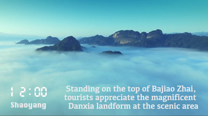 Standing on the top of Bajiao Zhai, tourists appreciate the magnificent Danxia and form at the scenic area.