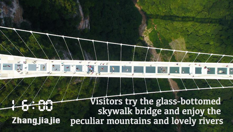 Visitors try the glass-bottomed skywalk bridge and enjoy the peculiar mountains and lovely rivers.