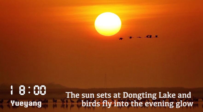 The sun sets at Dongting Lake and birds fly into the evening glow.