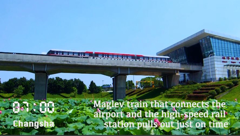 Maglev train that connects the airport and the high-speed rail station pulls out just on time.