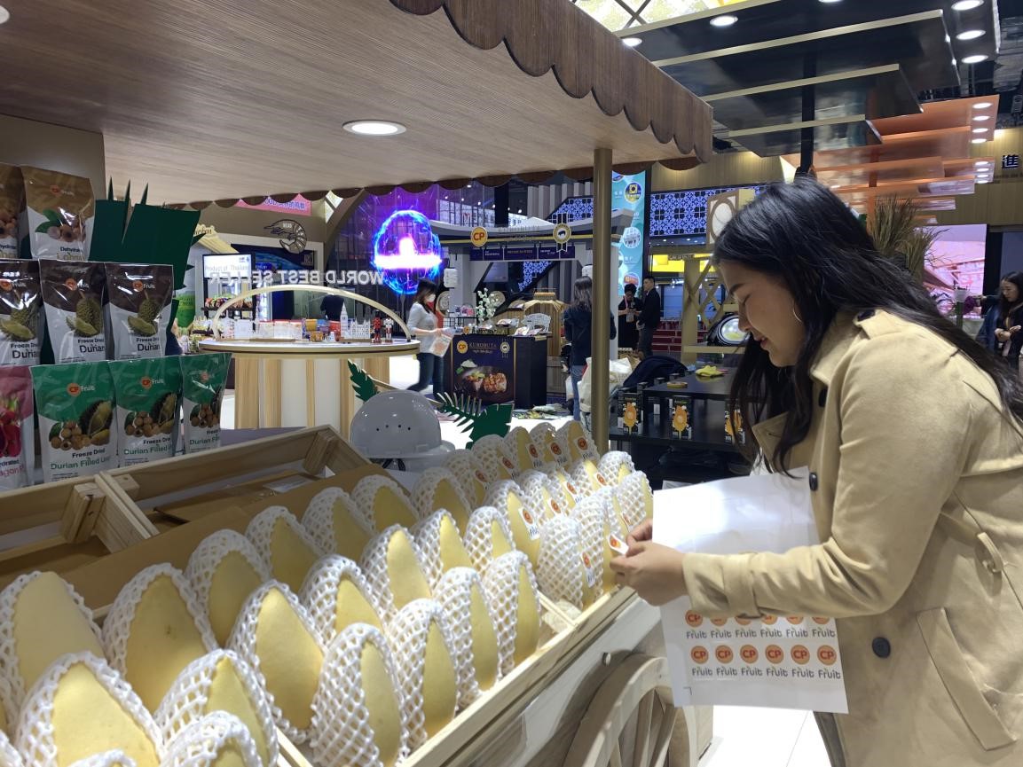 The booth of Thai multinational Charoen Pokphand Group is both concise and modern, with distinct Thai style. The conglomerate has brought to the expo nearly 400 kinds of products, including fruit, poultry meat, seafood, convenience food, edible bird’s nests, rice, and seasoning.