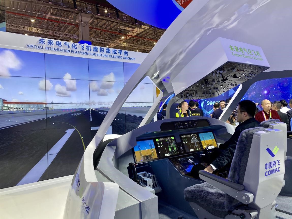 A visitor experiences virtual airplane piloting in a simulated cabin at the Chinese Pavilion of the second CIIE. (Photo by Wang Xiaobo from People’s Daily)