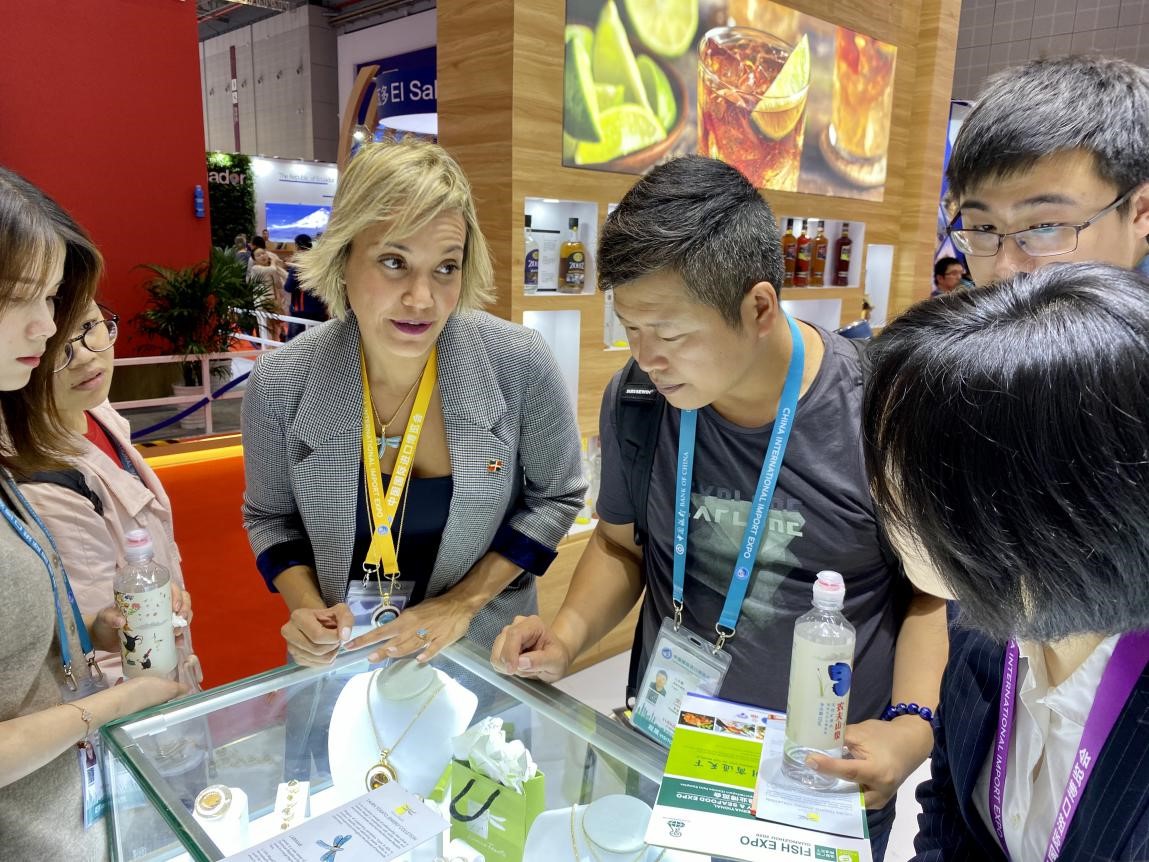 A staff member at the jewelry booth of the Dominican Republic pavilion introduces products to Chinese buyers. (Photo by Wang Xiaobo, People's Daily)