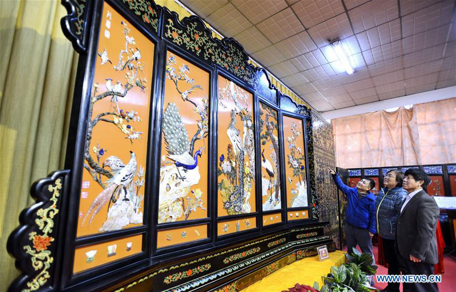 A large jade carving inlaid screen is seen at an exhibition in an art museum in Beijing, capital of China, Nov. 9, 2019. The exhibition kicked off here on Saturday, displaying nearly 10,000 pieces of lacquer and jade wares made by skillful craftsmen from Beijing and Yangzhou, a city of east China's Jiangsu Province. (Xinhua/Li Xin)