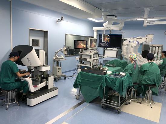 A robotic system, developed by Shanghai-based tech company MicroPort, has helped complete a Robot Assisted Laparoscopic Radical Prostatectomy (RALRP) at a hospital in the metropolis, China’s first such surgery by a domestically made device. (Photo/China Youth Daily)