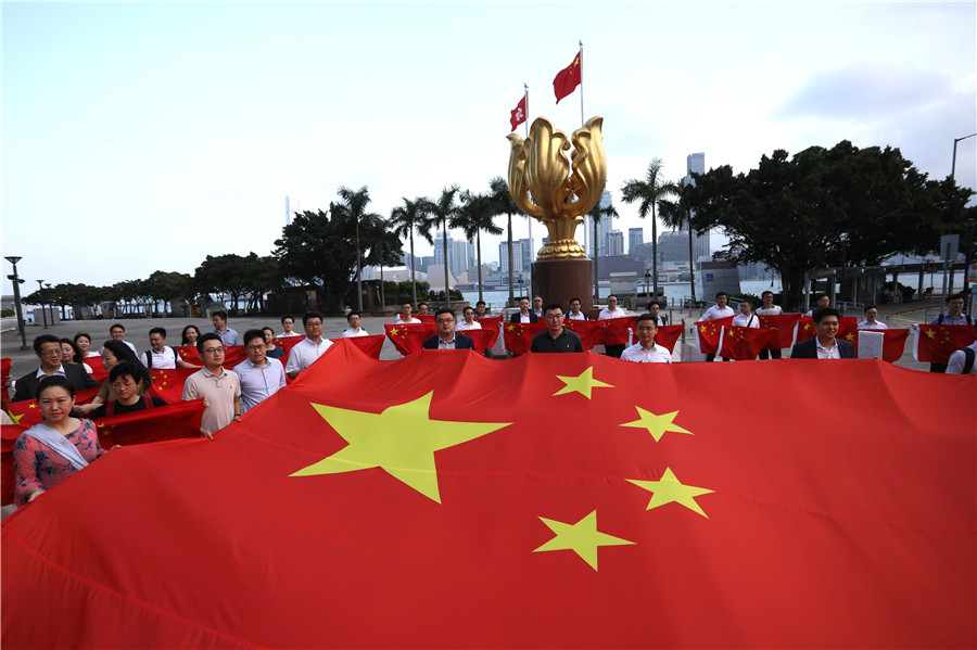 More than 100 residents of Hong Kong, mostly young people, awaken the city by sending their best wishes to the nation and the city at Wan Chai's Golden Bauhinia Square, on Sept 17, 2019. [Photo/China Daily]