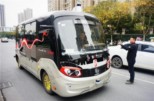 A citizen takes a photo of a 5G driverless microbus in Hangzhou, East China's Zhejiang province, on Nov. 26, 2019. (Photo/Asianewsphoto)