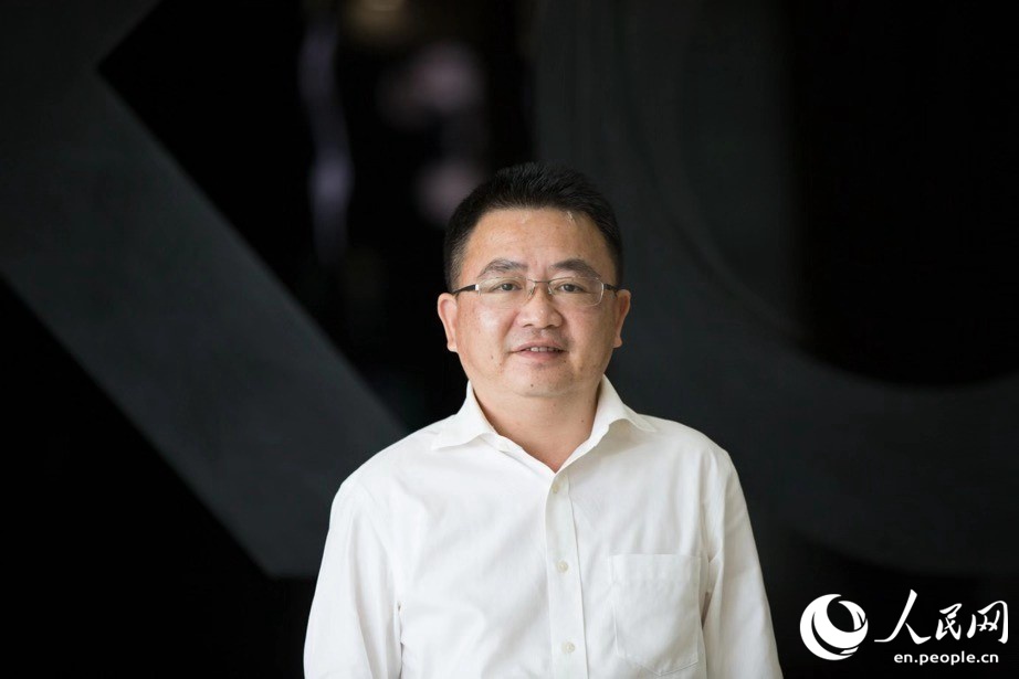 Wang Chengbing, Deputy General Manager of Beihai Huike Electronics Co., Ltd., introduces a see-through TV during an interview. (Photo/Tanja Herko)