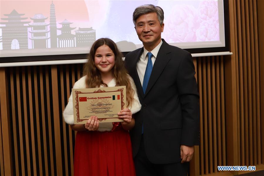 Chinese ambassador to Ireland He Xiangdong poses for a photo with Maia Griffin Sugarman, first prize winner for the secondary school category at the award ceremony of "China in My Eyes Art Competition" in Dublin, Ireland, Dec. 1, 2019. An award ceremony of a painting competition aiming to promote a better understanding of China among Irish primary and secondary school students was held here on Sunday. Named "China in My Eyes Art Competition", the event is co-organized by Confucius Institutes of University College Dublin (UCD) and University College Cork (UCC) with the support from the Chinese embassy in Ireland. (Xinhua)