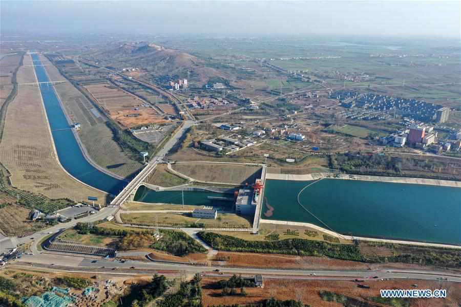 Aerial photo taken on Dec. 9, 2019 shows a part of the middle route of the south-to-north water diversion project in Xichuan County of Nanyang, central China's Henan Province. The middle route project has been carrying water through canals and pipes from the Danjiangkou Reservoir through Henan and Hebei provinces before reaching the cities of Beijing and Tianjin since the project started in December 2014. (Xinhua/Feng Dapeng)