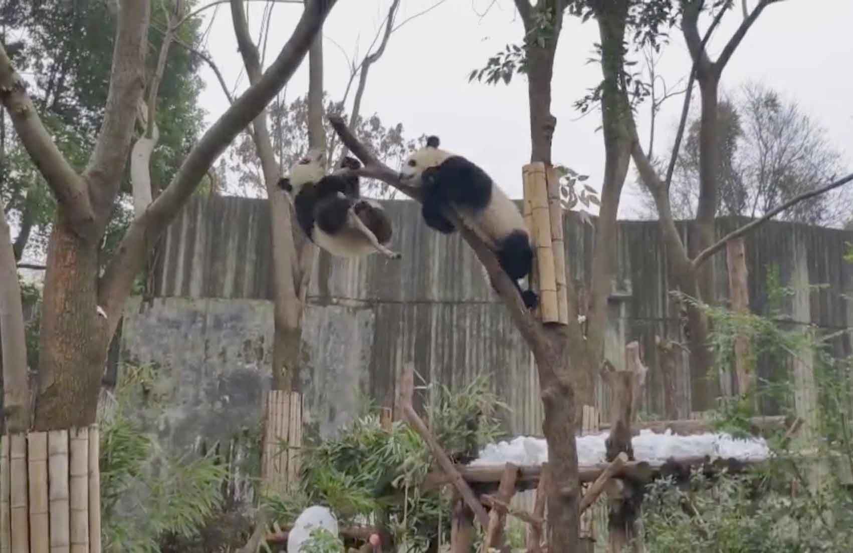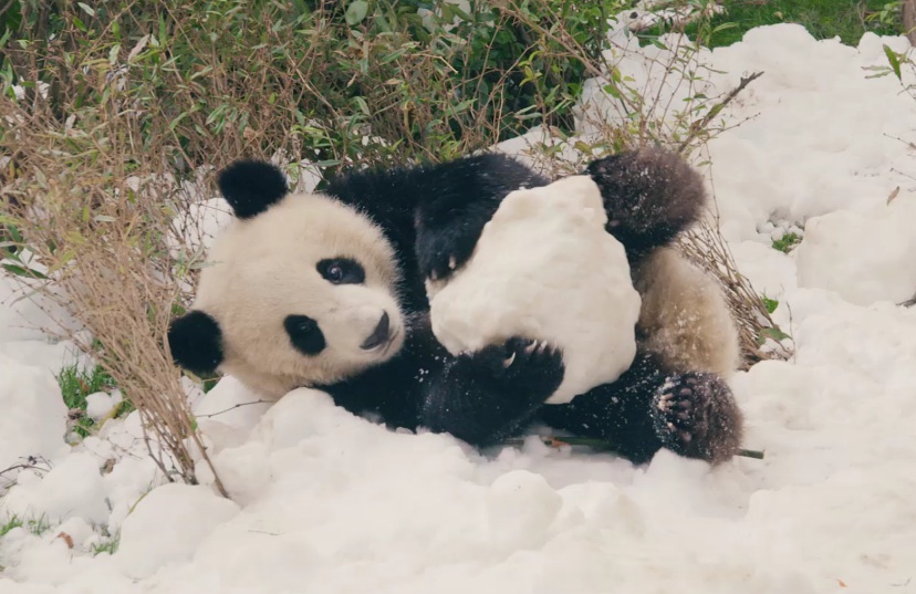 Pandas at the Chengdu Research Base of Giant Panda Breeding were finally able to frolic in the snow after artificial flakes made by the staff members covered the playgrounds of the cuddly animals on Dec. 25.