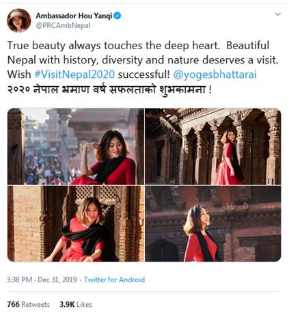 Chinese Ambassador to Nepal Hou Yanqi posted pictures of herself on social media on New Year’s Eve to promote Nepal tourism to people around the world, news portal ThePaper.cn reported on Jan. 2, 2020.