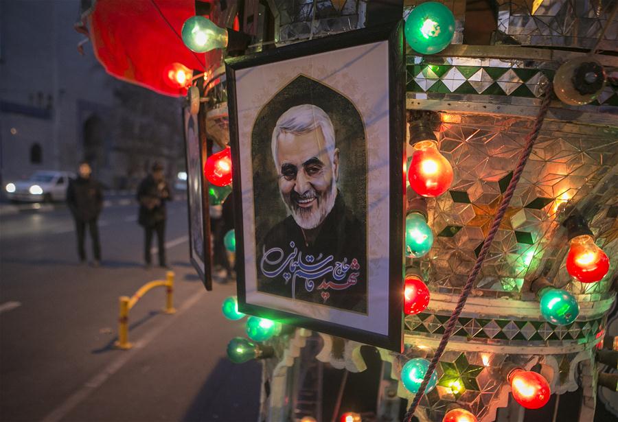 A poster of top Iranian commander Qasem Soleimani is seen on a street in Tehran, Iran, on Jan. 3, 2020. An attack near Baghdad International Airport on Friday has killed top Iranian commander Qasem Soleimani, and Abu Mahdi al-Muhamdis, the deputy top leader of Iraq's paramilitary Hashd Shaabi forces. (Photo by Ahmad Halabisaz/Xinhua)