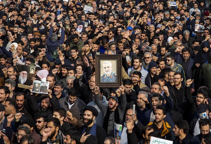 People attend a protest against the killing of top Iranian commander Qasem Soleimani in Tehran, Iran, on Jan. 3, 2020. An attack near Baghdad International Airport on Friday has killed top Iranian commander Qasem Soleimani, and Abu Mahdi al-Muhamdis, the deputy top leader of Iraq's paramilitary Hashd Shaabi forces. (Photo by Ahmad Halabisaz/Xinhua)