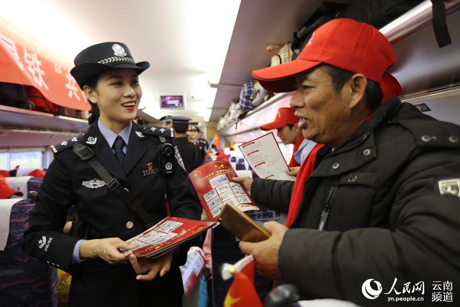 A railway policewoman teaches passengers about railway safety. Photo by Huang Zaiyun