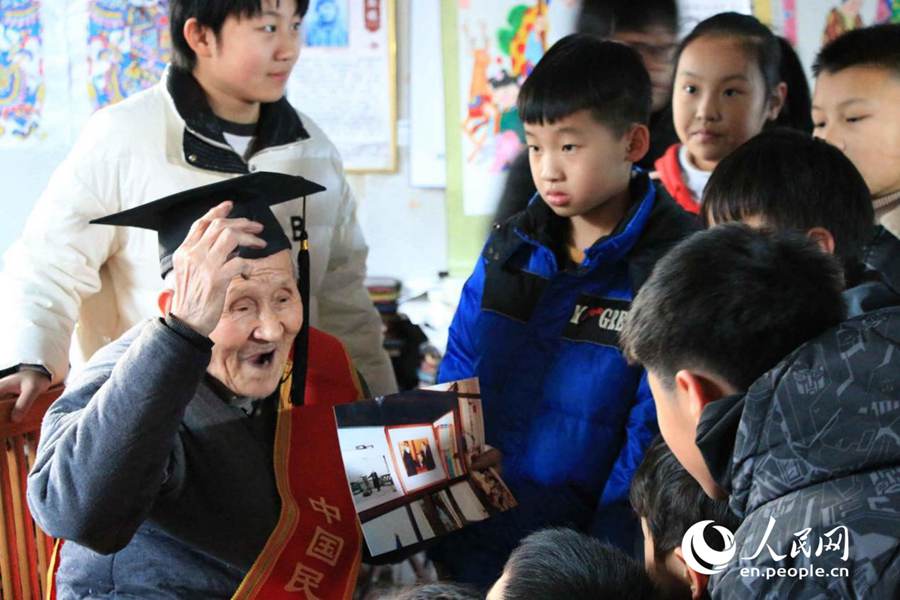 Students study the art of woodblock New Year painting from Yang Luoshu (L) in his workshop in Yangjiabu Village of Hanting District in Weifang, east China's Shandong Province, Jan. 20, 2020. (Photo/Liu Jing)