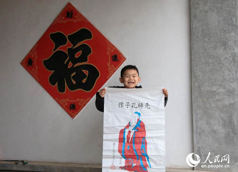 A student shows Yang Luoshu's artwork in Weifang, east China's Shandong Province, Jan. 20, 2020. (Photo/Liu Jing)