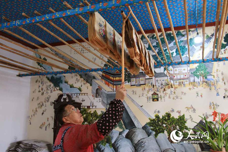 Folk artists hang newly-made woodblock New Year paintings up to dry at the Yangjiabu Folk Art Grand View Garden in Weifang, east China's Shandong Province, Jan. 20, 2020. (Photo/Liu Jing)