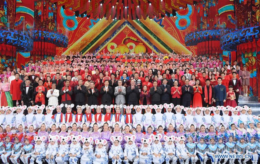 Huang Kunming, a member of the Political Bureau of the Communist Party of China (CPC) Central Committee and head of the Publicity Department of the CPC Central Committee, poses for a group photo when inspecting the rehearsal of China Central Television's annual Spring Festival TV gala in Beijing, capital of China, Jan. 22, 2020. Huang visited staff and extended his greetings for the upcoming holiday. (Xinhua/Shen Hong)