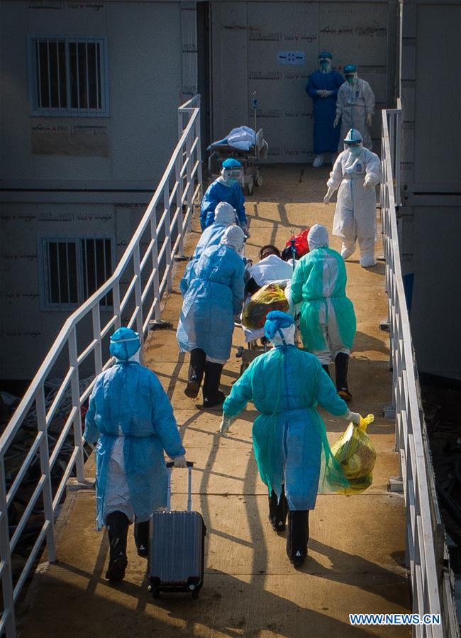 Aerial photo taken on Feb. 4, 2020 shows medical workers helping the first batch of patients infected with the novel coronavirus move into their isolation wards at Huoshenshan (Fire God Mountain) Hospital in Wuhan, central China's Hubei Province. (Xinhua/Xiao Yijiu)