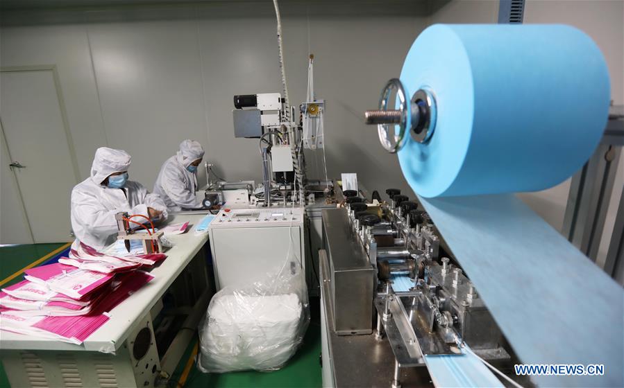 Workers make masks at a workshop of a medical material producing company in Jiaozuo City, central China's Henan Province, Feb. 9, 2020. Since the outbreak of the novel coronavirus, medical supplies manufacturing companies across China have been producing medical supplies at full capacity to power the fight against the epidemic. (Photo by Feng Xiaomin/Xinhua)