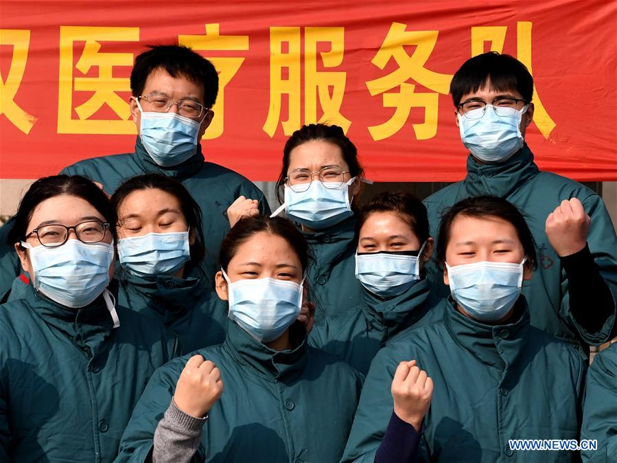 Liu Guangyao (1st R, back) and Qiao Bing (2nd R, back) pose for a group photo with their teammates before setting off for Wuhan in Hubei Province, in Zhengzhou, central China's Henan Province, Feb. 2, 2020. Liu Guangyao and Qiao Bing, both medical workers born in the 1990s, have been in love for more than 2 years. During the outbreak of coronavirus, they signed up for the medical team to aid the coronavirus control efforts in Hubei. Before setting off, they cheered for each other and promised to get married once they come back to Henan. (Xinhua/Li An)