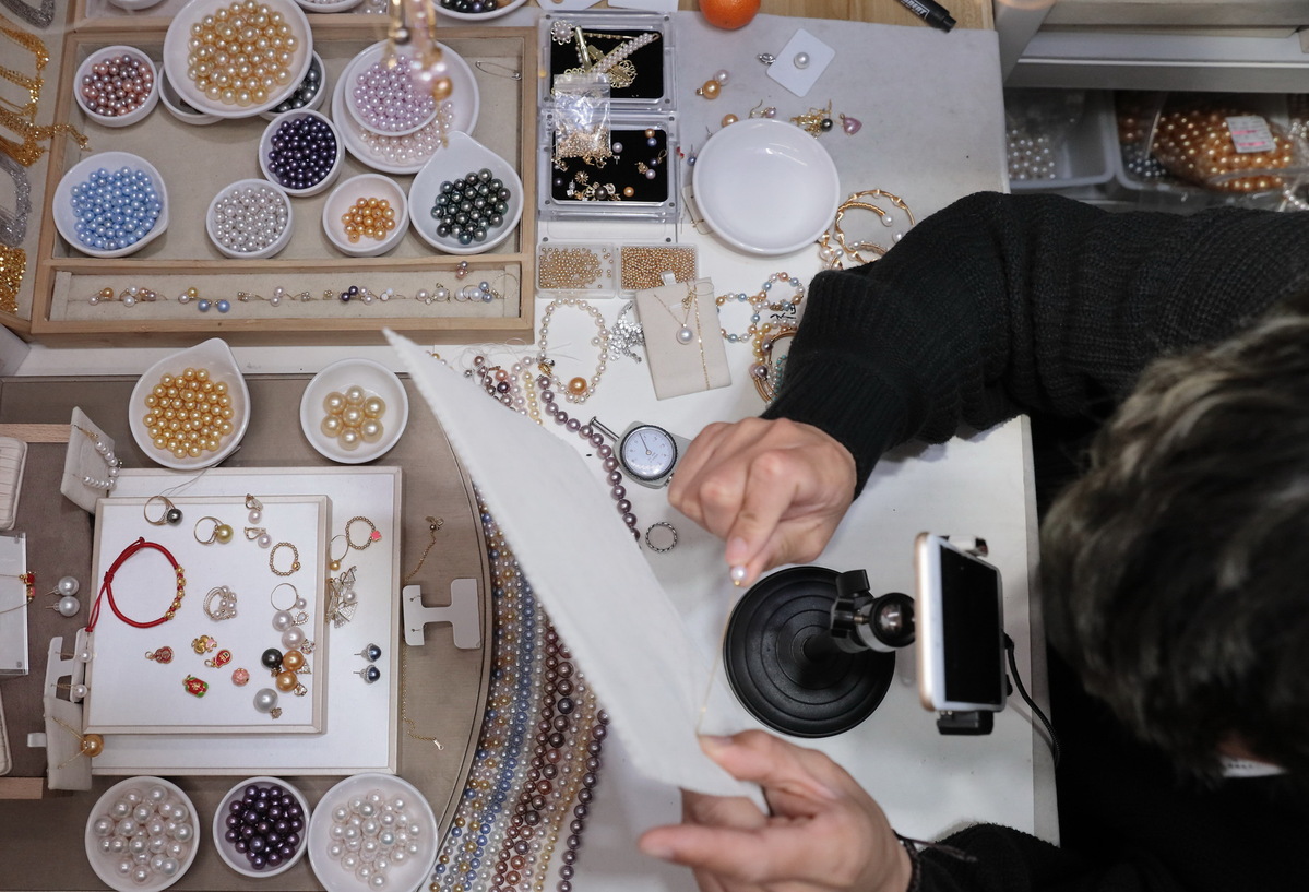 A staff member livestreams online to promote pearl accessories in Xiahu county of Zhuji, East China's Zhejiang province, Feb 17, 2020. [Photo/Xinhua]