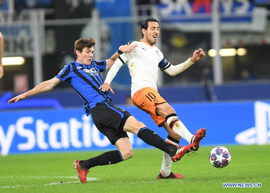Atalanta's Marten de Roon (L) vies with Valencia's Daniel Parejo (R) during the UEFA Champions League round of 16 first leg match between Atalanta and Valencia in Milan, Italy, Feb. 19, 2020. (Photo by Alberto Lingria/Xinhua)