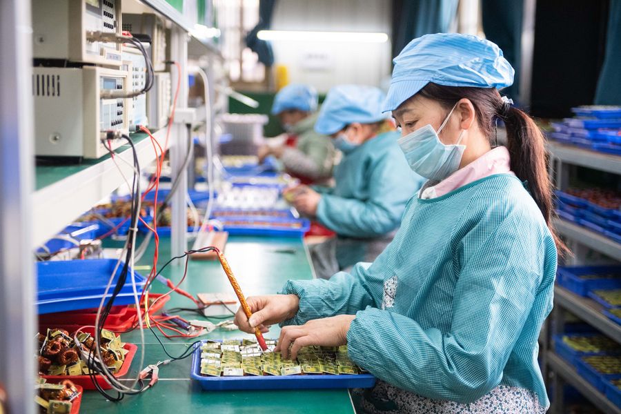Workers examine inductors produced at a poverty alleviation workshop in Taoyuan County, central China's Hunan Province, Feb. 20, 2020. After taking sufficient measures of preventing the novel coronavirus, many production lines of the workshop have resumed production. (Photo by Chen Sihan/Xinhua)