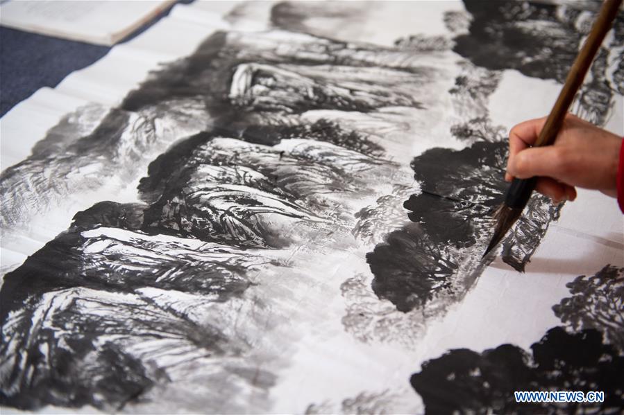 Painter Wan Yonghong works on a traditional Chinese painting at home in Xinhe Village of Xiaohe Township in Liuyang, central China's Hunan Province, Feb. 25, 2020. Xiaohe has 460 part-time painters who work at art studios in town. After the outbreak of the coronavirus, they continued their work at home. (Photo by Chen Sihan/Xinhua)