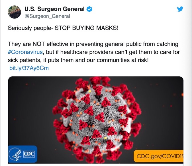 On Feb. 29, the U.S. Surgeon General Dr. Jerome Adams urged Americans to stop buying masks on Twitter.