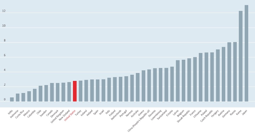 According to OECD data, the US has 2.8 hospital beds per 1,000 people. (Source: OECD)