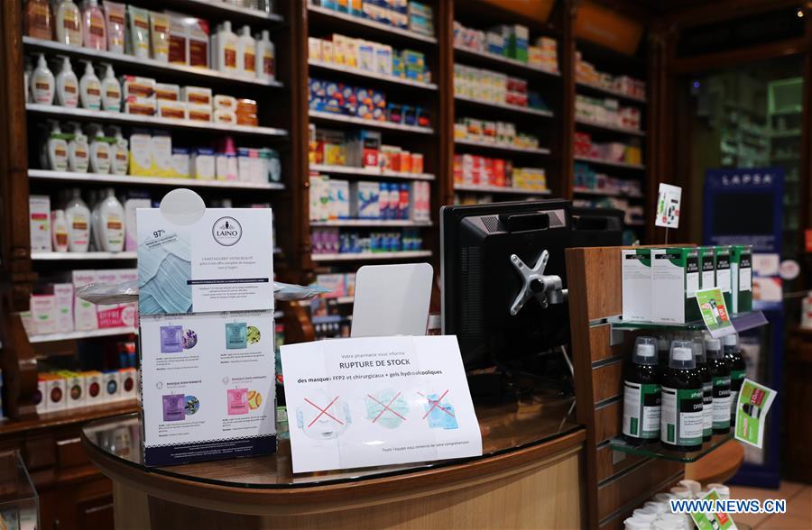 A sign reading "shortage of FFP2 protective face mask, chirurgical face mask and alcohol hand sanitising gel" is seen at a pharmacy in Dieppe, northeastern France, March 4, 2020. COVID-19 cases in France rose to 285 on Wednesday, up by 73 from a day earlier, Health General Director Jerome Salomon said at a daily briefing over the novel coronavirus outbreak. (Xinhua/Gao Jing)