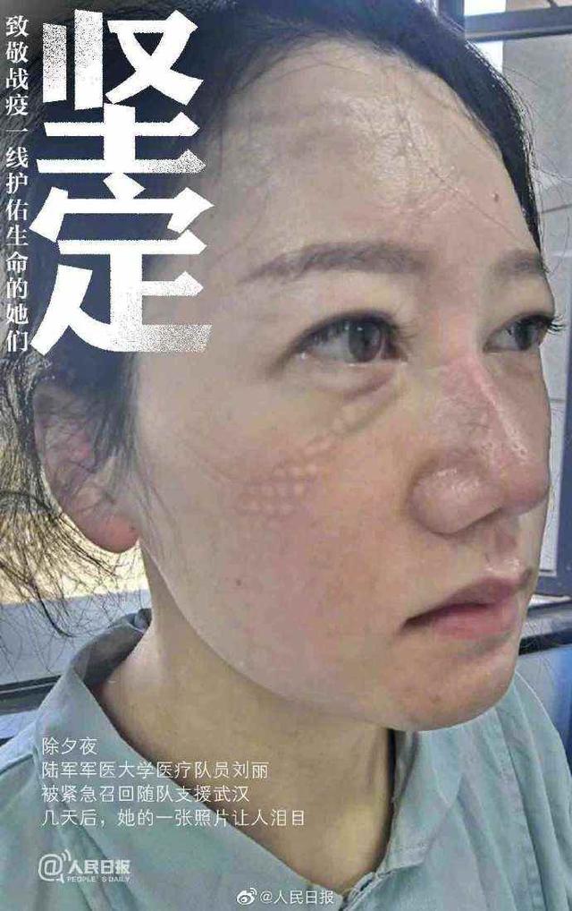 The photo shows a medical worker named Liu Li with dents on her face after caring for coronavirus patients. Liu Li, from the Third Military Medical University in southwest China’s Chongqing municipality, was sent to assist Wuhan, the epicenter of the novel coronavirus outbreak, on the eve of the Chinese New Year.