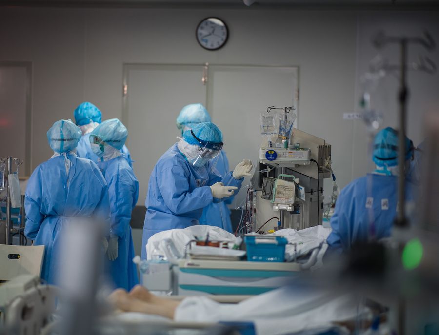 Members of medical assistance team from Zhejiang are busy at the ICU (intensive care unit) of Wuhan pulmonary hospital in Wuhan, central China's Hubei Province, March 19, 2020. (Xinhua/Xiao Yijiu)
