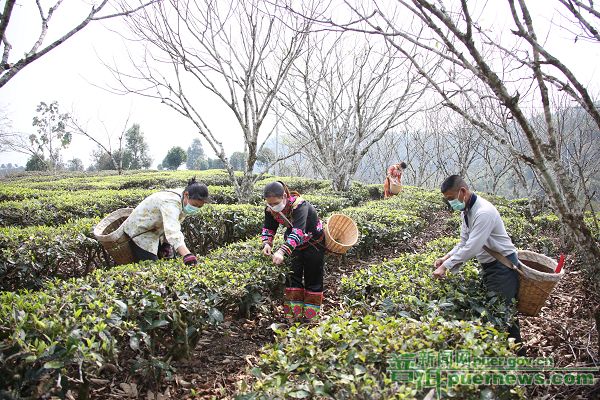 On February 27, there are numerous tea trees with fresh buds and green shoots located at the tea base of Mangeba Village, Nanping Town, Simao District, Pu'er City. Tea-picking workers wear masks to exploit the first buds of the year.