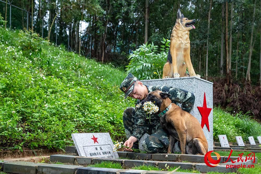 Kong Dexin, a dog trainer, and his companion "Kate" present flowers to the military dogs.