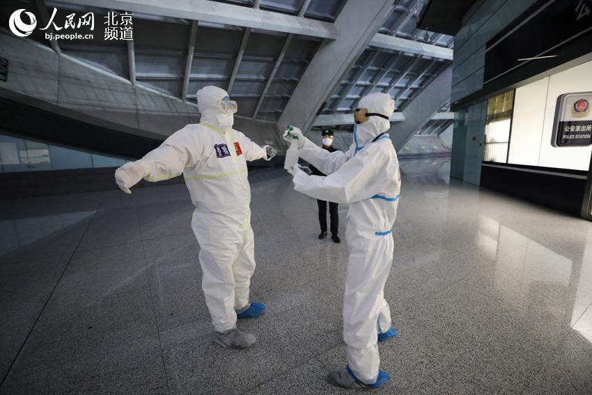 Team members go through strict disinfection procedures when their shift changes. (People’s Daily Online/Yin Xingyun)